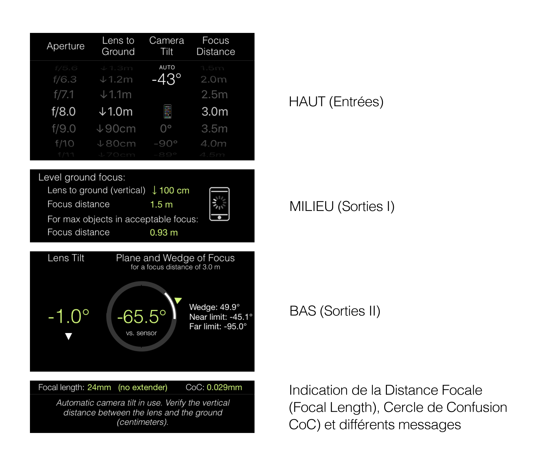 L’écran princial de Tilt Calculator contient trois parties distinctes: HAUT (Entrées), MILIEU (Sorties I), BAS (Sorties II), voir ci-dessous. Tout en bas de l’écran, vous sont indiqués la Distance Focale que vous avez choisie (plus extension si utilisée), ainsi que plusieurs messages de rappel.