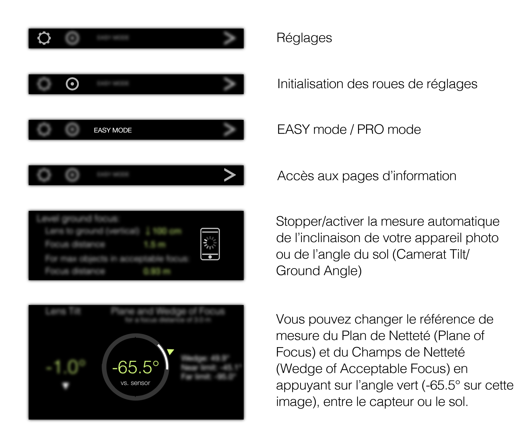 Les roues de réglage permettent d’ajuster: La Distance Objectif-sol (Lens-to-ground Distance) (verticale), l’Inclinaison de votre appareil photo (Camera Tilt) (et celle du Sol (Ground Angle)), l’Ouverture de l’objectif (Lens Aperture), et la Distance Focale.
